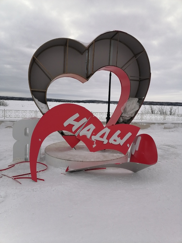 Жители Надыма сфотографировали разбитое сердце на набережной: фигура оказалась разрушена. Снимки опубликовали в группе «Злой и добрый надымчанин» во «ВКонтакте».