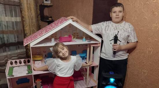 Брат и сестра из Волновахи получили новогодние подарки с Ямала. Сотрудники окружного департамента безопасности подарили мальчику-подростку большую беспроводную колонку, а его младшей сестре – кукольный домик.